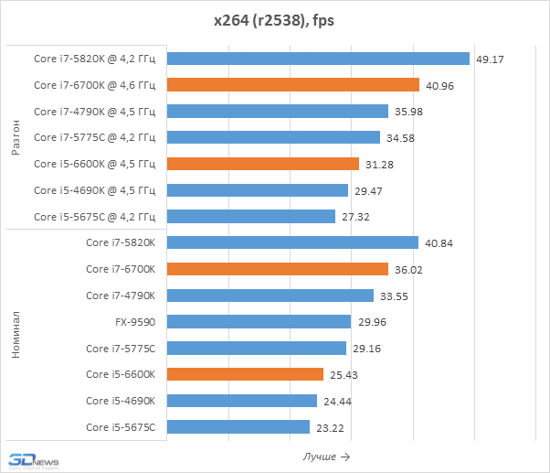 Любопытно, что по скорости кодирования H.264-видео процессоры Skylake-S тоже проигрывают Broadwell-DT. Иными словами, встроенное в Core i7-5775C и Core i5-5675C графическое ядро Iris Pro 6200 – самый производительный интеловский GPU при нагрузке любого характера. Что же касается работы QuickSync у Core i7-6700K и Core i5-6600K, то результаты тестирования показывают, что скорость этой технологии при работе с H.264-контентом почти не изменилась по сравнению с процессорами Haswell. Так что все улучшения QuickSync в Skylake связаны с добавлением поддержки новых форматов и совершенствованием качества перекодирования, оценить которые в полной мере мы пока не можем из-за отсутствия совместимого программного обеспечения.