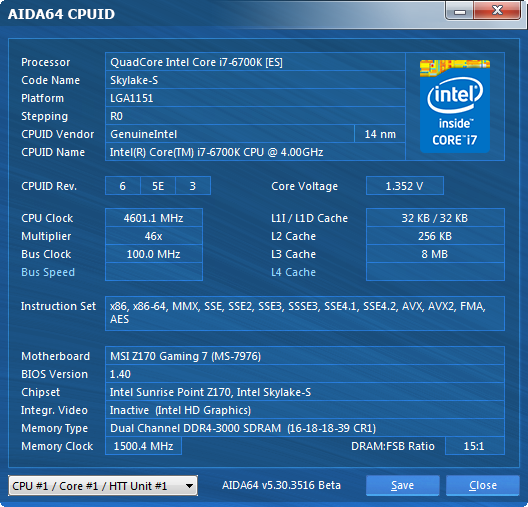 Процессор у нас сегодня представлен инженерным семплом с маркировкой QJE6. ![]() В качестве операционной системы использовалась Microsoft Windows 7 Ultimate x64 SP1 со всеми критическими обновлениями и с установкой драйверов Intel Chipset Drivers 10.1.2.9 WHQL, GeForce 353.62 WHQL и сетевых драйверов версии 1.1.55.1538. Стабильность системы при разгоне мы проверяли преимущественно стресс-тестом LinX 0.6.5 AVX, а мониторинг осуществлялся с помощью HWiNFO64 версии 5.03-2595 Beta. При полностью автоматических настройках BIOS MSI Z170A Gaming M7 запустила процессор в штатном режиме, а вот частоту памяти занизила с 2800 до 2133 МГц. При таких щадящих настройках, разумеется, тест Linpack был пройден безошибочно. При этом, даже несмотря на использование не самого эффективного воздушного кулера, пиковая температура наиболее горячего ядра процессора не превысила отметку 63 градуса Цельсия, да и прочие температуры можно назвать весьма скромными для Linpack. Далее мы активировали в BIOS один из XMP-профилей памяти, выбрав частоту 3000 МГц с базовыми таймингами 16-18-18-390_1T при напряжении 1,35 В. И в таком режиме тест был завершён без сбоев и ошибок. Отметим, что показатели GFlops и температура процессора заметно выросли в сравнении с первым тестом. Следующим нашим шагом была проверка максимально возможной частоты процессора при CPU Strap, равном 100 МГц. Напряжение процессора нам пришлось повысить до 1,350 В, а стабильности мы достигли только на частоте 4600 МГц, или всего +15 % к номинальной частоте. ![]() Поскольку Linpack продолжал чудить с температурой и напряжением нового процессора, что хорошо видно по следующему скриншоту, то стабильность мы дополнительно проверили с помощью Prime95 и архиватора 7-Zip. К сожалению, при дальнейшем разгоне процессора стабильности уже не удавалось достичь, хотя отдельные тесты он был способен пройти на частоте 4700 МГц. ![]() После определения предела разгона процессора мы выяснили, как плата способна разгоняться по BCLK. Оказалось, что MSI Z170A Gaming M7 стабильна на частоте BCLK 200 МГц в шести тестах, включая Linpack и Prime95. Впечатляющий результат, в особенности для плат предыдущего поколения чипсетов Intel. Вполне вероятно, что можно было бы достичь и ещё более высокой частоты BCLK, но с практической точки зрения такой разгон бесполезен, поэтому на данной отметке мы и завершили изучение разгонных возможностей платы MSI. На отдельный разгон памяти времени уже не хватало, поэтому сразу же перешли к тестам. Производительность Мы сравнили производительность MSI Z170A Gaming M7 с результатами одной из лучших платформ предыдущего поколения — материнской платы ASUS Maximus VII Hero. Система была оснащена процессором Intel Core i7-4790K, разогнанным до 4625 МГц, и 16 Гбайт памяти DDR3, работающей на частоте 2250 МГц. Вот какую разницу в производительности мы получили.