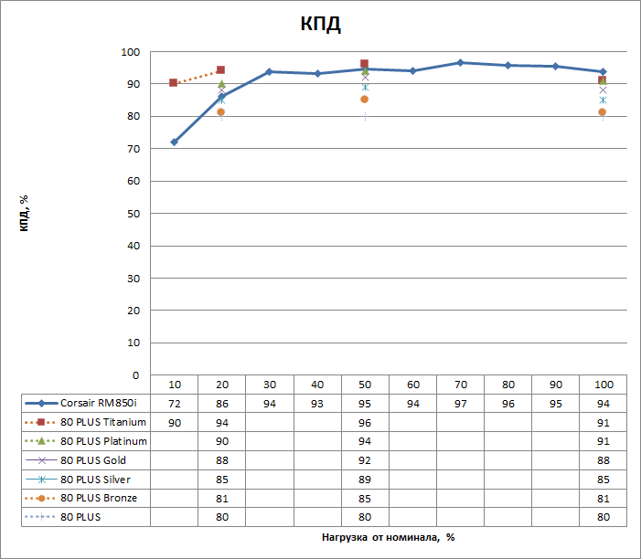 ⇡#КонструкцияСемейство RM/RMi унаследовало фирменный дизайн блоков питания Corsair — корпус увесистый и прочный. Более дешевые серии у этой фирмы выглядят намного проще. Интерфейс Corsair Link позволяет контролировать напряжения и токи с помощью датчиков в самом БП. Для соединения с материнской платой на корпусе есть стандартный разъем Mini USB. Кнопка рядом выполняет сомнительной полезности функцию – тест встроенного вентилятора. ⇡#Внутреннее устройствоБП охлаждается вентилятором Corsair NR135P типоразмера 135 мм на гидродинамическом подшипнике. Основная начинка изготовлена фирмой Channel Well Technologies (CWT). Входной фильтр ЭМП включает 3 пары конденсаторов CY, 2 штуки CX и два синфазных дросселя. Для защиты от скачков напряжения используется стабилитрон. Топология основного преобразователя представляет собой резонансный вариант Full Bridge. Во вторичной цепи используется синхронный выпрямитель. Напряжение 12 В с единственной вторичной обмотки трансформатора конвертируется в 3,3 и 5 В с помощью DC-DC-преобразователей. Комбинация этих решений отличает наиболее эффективные БП среди всех, которые можно найти в продаже сегодня. Для сглаживания пульсаций на выходе БП используются твердотельные и электролитические конденсаторы производства Nippon Chemi-Con. Часть из них распаяна прямо на дочерней плате, к которой подключаются кабели. ⇡#Методика тестированияМетодика тестирования, принятая в 3DNews, описана в отдельной статье, которая рекомендуется к прочтению для понимания принципов работы компьютерных блоков питания и их важнейших характеристик. Обращайтесь к ней, чтобы узнать, зачем нужен и как работает тот или иной компонент, упомянутый в обзоре, и как интерпретировать результаты тестирования. Результаты тестирования На отметке 20 % номинальной мощности КПД Corsair RM850i не дотягивает лишь 2 % до требований спецификации 80 PLUS Gold, но это вполне можно списать на погрешность ваттметра, который мы используем в измерениях. В остальной части диапазона мощности этот БП безупречен. ![]() По данным производителя, при нагрузке меньше 40 % от номинала (340 Вт) БП должен охлаждаться пассивно (с учетом температуры воздуха 25 °C). В нашем тесте вентилятор запустился лишь на отметке 60 % мощности (510 Вт) и достиг скорости вращения 944 об/мин при максимальной нагрузке. ![]() Кросс-нагрузочная характеристика блока питания не вызывает претензий: отклонение напряжений от номинала укладывается в 3 %. Единственное но: наш стенд не позволяет взять больше 60 А из шины 12 В, что задает предел мощности в 720 Вт. Однако если судить по исходным данным устройства и полученным результатам, в диапазоне от 720 до 850 Вт на шине 12 В Corsair RM850i едва ли подведет. ![]() Амплитуда пульсаций на шинах 5 и 12 В даже при полной загрузке БП не превышает 20 мВ (при допустимых значениях 50 и 120 мВ соответственно).