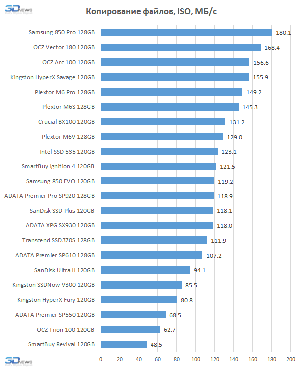 В тестах копирования группа лидеров состоит из пяти накопителей. В неё входят: Samsung 850 Pro, который благодаря контроллеру MEX и трёхмерной MLC V-NAND оказывается в числе первых по производительности вообще всегда; OCZ Vector 180 и Arc 100 – два похожих SSD на базе восьмиканального контроллера Barefoot 3 и MLC NAND компании Toshiba с 64-гигабитными ядрами; Kingston HyperX Savage, который пользуется таким же массивом памяти и основывается на контроллере Phison PS3110-S10; а также Plextor M6 Pro, в основе которого лежит восьмиканальный контроллер Marvell 88SS9187 и всё та же MLC-память Toshiba.