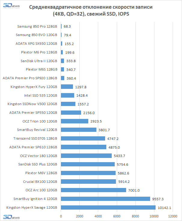 На следующей диаграмме приводится среднеквадратичное отклонение скорости записи при нахождении SSD в свежем состоянии после сохранения на него первых 8 Гбайт данных. Многие современные накопители, к сожалению, не могут похвастать стабильностью латентностей при обработке однотипных операций записи, и на следующей диаграмме это хорошо видно. Наблюдающийся у многих потребительских SSD высокий разброс моментальных скоростей – это серьёзный дефект, который не позволяет использовать обладающие им накопители как в производительных RAID-массивах, так и просто в тех системах, где важна быстрая и предсказуемая реакция дисковой подсистемы.