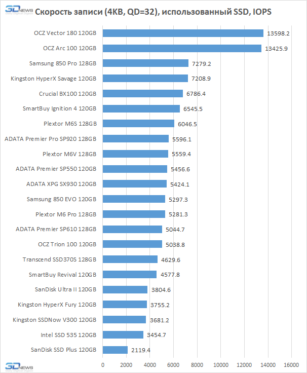 При случайной записи без очереди запросов наилучшую производительность показывают накопители OCZ на базе контроллера Barefoot 3, Samsung 850 EVO, пробившийся в число лидеров благодаря технологии TurboWrite, и ADATA SP920, работающий на производительной платформе Marvell. Однако появление очереди запросов полностью изменяет этот расклад. В лидеры выходит уникальный Samsung 850 Pro с трёхмерной двухбитовой флеш-памятью, а также Kingston HyperX Savage и другие накопители, имеющие быструю подсистему памяти. То есть такую, которая сформирована 64-гигабитными устройствами MLC NAND.