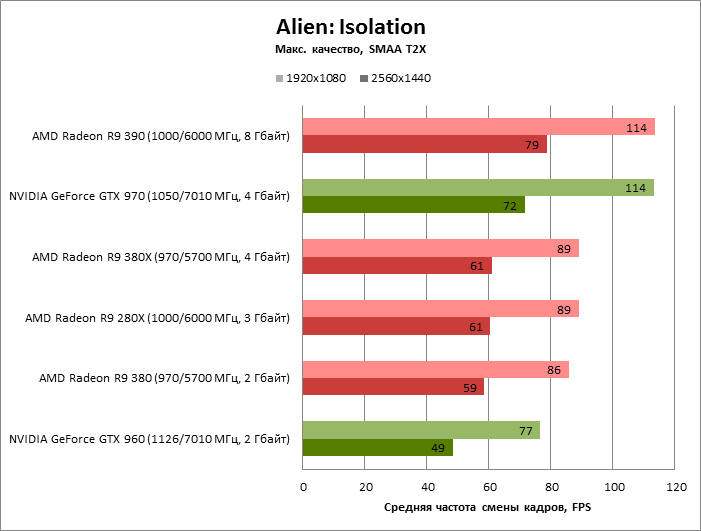 GeForce GTX 960 имеет более медленный GPU, что сказывается на средней игровой производительности (даже меньше, чем у Radeon R9 380), и зачастую страдает от той же проблемы – недостаточного для современных игр объема RAM в 2 Гбайт.