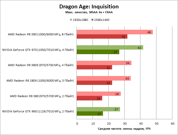 Radeon R9 380 «без икса» обеспечивает 87-91 % быстродействия своего старшего брата, но есть выдающиеся примеры (Dragon Age: Inquisition, Middle-Earth: Shadow of Mordor, Total War: Attila), когда объем RAM выходит на первый план и R9 380 просто «тонет» со своими 2 Гбайт памяти.
