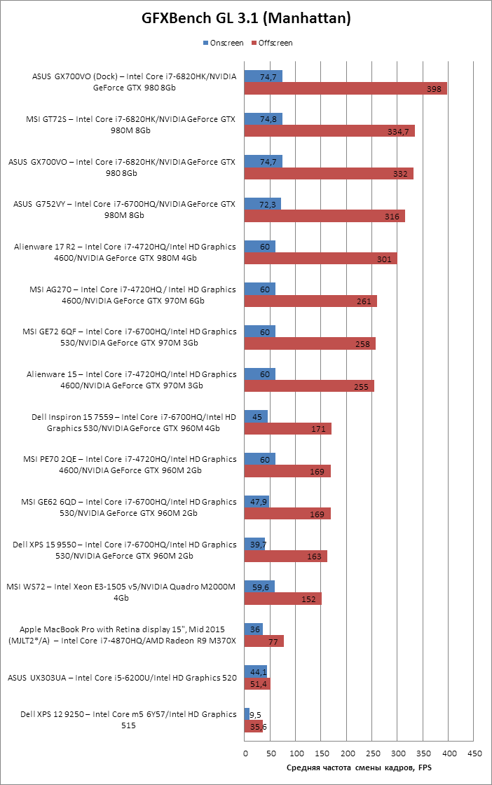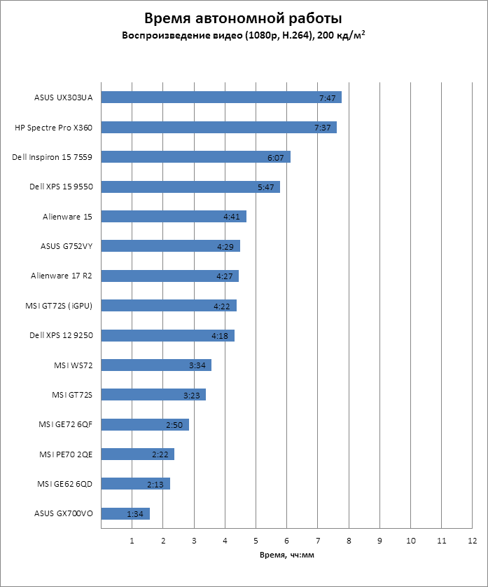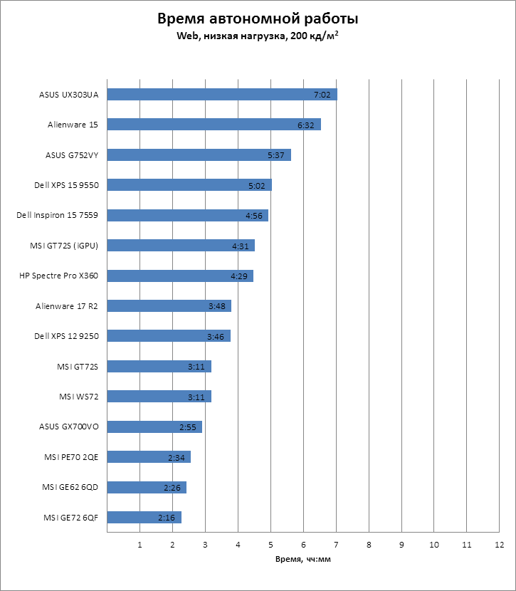 Максимальная яркость на белом поле в центральной точке дисплея составила 468 кд/м2, коэффициент контрастности в среднем — 1300:1. Минимальная яркость — 23 кд/м2. Изменение яркости практически линейно. После калибровки под цветовую температуру 6500 К яркость снижается на целых 15 %, а при отключении питания и работе от аккумулятора она просаживается ещё в среднем на 10 % от возможного максимума. Нижняя граница при этом остаётся практически неизменной – 23 кд/м2. Коэффициент контрастности снижается незначительно. У нашего подопытного не оказалось проблем с адаптивной системой подсветки, так что цветовая температура и настройка гамма-кривых не меняется при отключении зарядного устройста. А вот качество тоновых переходов при работе от батареи заметно хуже, чем при питании от сети. Никаких цветовых профилей у XPS 12 нет. Также нет и возможности сузить цветовой охват до sRGB за счёт режимов эмуляции, как у профессиональных ноутбуков Dell с дисплеями Premier Color. При настройках по умолчанию цветовой охват составляет 99,5 % sRGB и 99,1 % AdobeRGB, что неудивительно — явно используется не простая W-LED-подсветка. Великолепный результат для дисплея компактного «гибрида». На такое способны лишь немногие профессиональные настольные мониторы. Однако без специального профиля или как минимум активации системного профиля AdobeRGB, к которому дисплей XPS 12 максимально близок, не обойтись. Точка белого настроена ближе к 5900 К с небольшим преобладанием паразитного оттенка. При этом все точки серого клина на CIE-диаграмме расположены максимально близко друг к другу, что обеспечивает высокую стабильность цветовой температуры. Гамма-кривые настроены не лучшим образом. Сильный подъём в центральной области приводит к высветлению средних оттенков, снижается визуальная контрастность изображения на экране. При активации системного профиля AdobeRGB результаты теста Argyll довольно хороши для устройства подобного рода. Среднее значение не превышает 2 единиц DeltaE94, а максимальное — чуть больше 5 единиц. Проведённая калибровка внесла довольно серьёзные правки в LUT видеокарты. После неё цветовой охват снизился до 98,8 % sRGB и 98,5 % AdobeRGB. По сравнению со стандартными настройками разница минимальна, её будет сложно заметить на глаз. Точка белого сдвинулась в нужную область, пропал паразитный оттенок. Но стабильность оттенков серого снизилась. Гамма-кривые пришли в норму и стали максимально близко лежать на референсной кривой со значением гаммы 2,2, чего и следовало ожидать. Финальные результаты теста Argyll CMS оказались очень высокими: 0,4 в среднем и 1,65 в максимуме. На этот раз программа ориентируется на цветовые возможности установленной матрицы (в пределах её нативного цветового охвата) и гамма-кривые без недостатков. В таком виде дисплей XPS 12 позволяет работать с цветом на профессиональном уровне, но исключительно при подключении устройства к розетке. Другой вопрос: как долго вы сможете проработать в Photoshop, Lightroom и прочих редакторах графики/фото с низкой производительностью перегревающегося Core m5 и плохой поддержкой 4К-дисплеев? Но об этом ниже. ⇡#Система охлаждения и уровень шума В Dell XPS 12 9250 используется пассивная система охлаждения — и этим всё сказано. Абсолютно бесшумно, тепло, а иногда и горячо… В простое или при минимальной непродолжительной нагрузке процессор нагревался до 40-43 градусов. Темпера