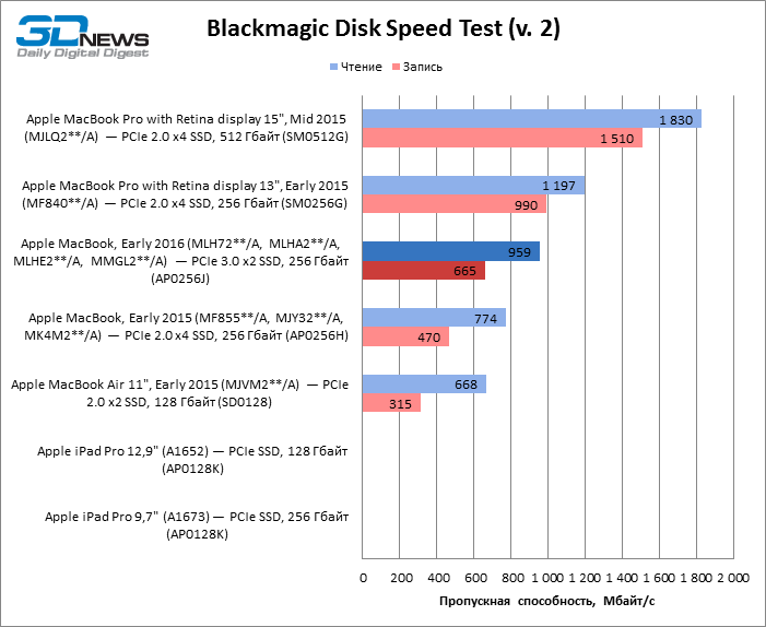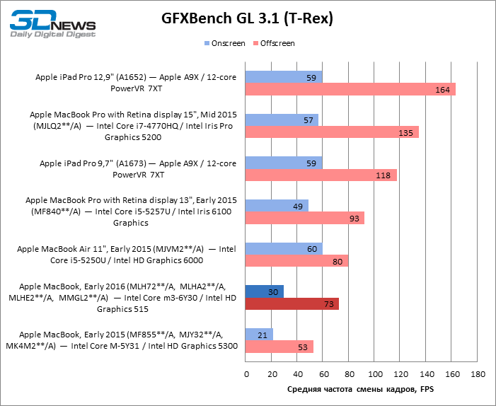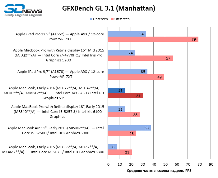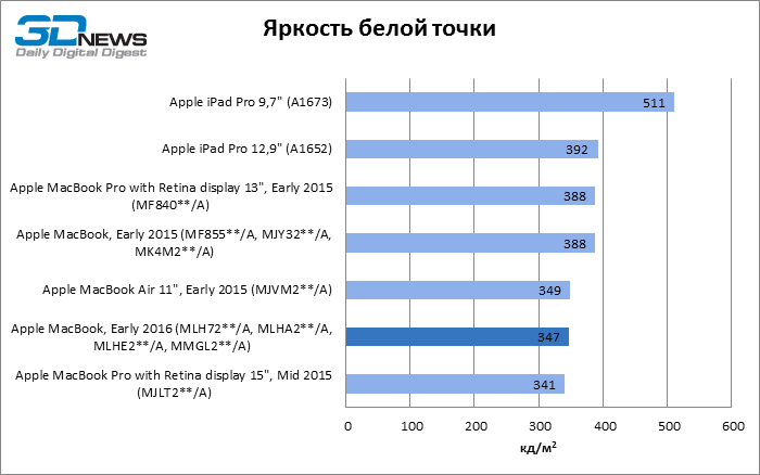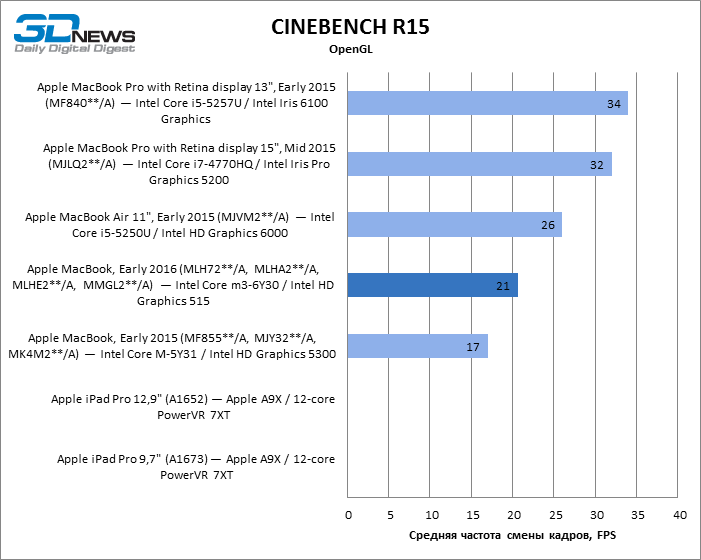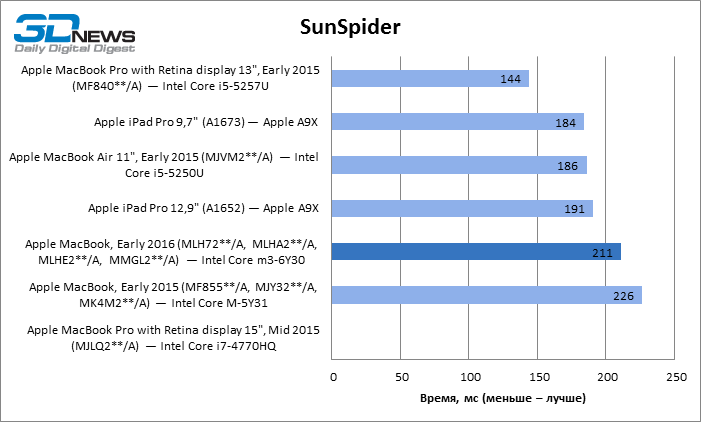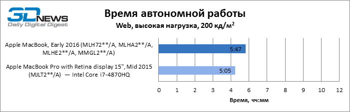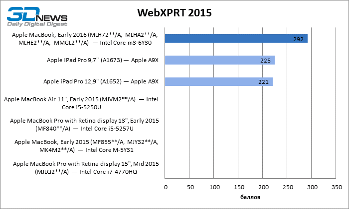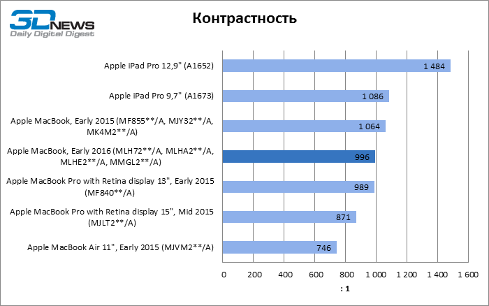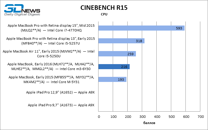 Geekbench 3 64-bit Как однопоточный, так и многопоточный тест Geekbench показывают, что Skylake обеспечил MacBook чувствительный прирост результатов и сократил до минимума отставание от MacBook Air с мобильной разновидностью процессора Core i5. Обе разновидности MacBook Pro недосягаемы для своего компактного собрата в этих бенчмарках CPU. Но более интересно, что iPad Pro не так уж сильно отстает в многопоточном тесте от MacBook Pro с двухъядерным CPU, а 12,9-дюймовая модель лидирует по однопоточной производительности. ![]() ![]() Cinebench R15 Данный тест доступен только в десктопной ОС, поэтому пришлось обойтись без iPad Pro. Здесь MacBook Air на Broadwell восстановил свое превосходство над 12-дюймовым MacBook как в процессорном, так и графическом бенчмарке, хотя в нем достоинства Skylake дают о себе знать. ![]() ![]() Sunspider В этом классическом бенчмарке JavaScript в связи с отсутствием результатов для 15-дюймового MacBook Pro лидерство принадлежит 13-дюймовой модели. 12-дюймовый MacBook уступил как Air, так и iPad Pro обоих размеров. ![]() WebXPRT 2015 В WebXPRT последней версии мы тестировали только трех участников сравнения. Более комплексная структура теста позволила MacBook прервать череду побед iPad Pro в предыдущих бенчмарках. ![]() GFXBench 3.1 Увеличенная пропускная способность RAM в Skylake играет на руку MacBook 2016 года, но польза от нее, столь выраженная при низкой нагрузке на GPU (тест T-Rex), снижается в более тяжелом графическом тесте (Manhattan). iPad Pro обладает лучшим GPU среди соперников, хотя TDP в корпусе с 9,7-дюймовым экраном сильно ограничивает его возможности сравнительно с 12,9-дюймовой моделью. ![]() ![]() Blackmagic Disk Speed Test v. 2 Тест ПЗУ доступен только для OS X, поэтому iPad Pro вновь выбывает из сравнения. Обновленный контроллер здесь существенно улучшил показатели MacBook, но до чрезвычайно быстрого SSD в MacBook Pro ему еще очень далеко. Многое зависит от объема накопителя, поэтому модель на 512 Гбайт наверняка обладает повышенным быстродействием и в компактном MacBook. ![]() ⇡#Результаты тестирования: дисплейВ модели MacBook, которую мы тестировали в прошлом году, установлена более яркая матрица — видимо, Apple в очередной раз поменяла поставщика или одновременно получает панели от нескольких различных производителей. 9,7-дюймовый экран iPad Pro обладает выдающейся яркостью, недосягаемой для соперников. ![]() На контрастность экрана в MacBook грех жаловаться: по этому параметру он превосходит 15,4-дюймовый MacBook Pro и ненамного уступает 9,7-дюймовому iPad Pro. Старшая модель iPad в этом плане является недосягаемым эталоном. ![]() Гамма-коррекция экрана MacBook работает в сторону немного повышенного контраста в средних тонах. ![]() ![]() Цветовая температура экрана приближена к стандарту D65. ![]() Цветовой охват дисплея покрывает пространство sRGB, а точка белого установлена настолько близко к целевой, насколько можно требовать от устройства, не рассчитанного на профессиональные приложения. ![]() ⇡#Результаты тестирования: время автономной работыПомимо героя обзора, только MacBook Pro с 15,4-дюймовым экраном в свое время прошел у нас тест автономной работы с реалистичной нагрузкой — обновление четырех копий главной страницы 3DNews с интервалом 5 с при яркости экрана 200 кд/м2. Это весьма энергоемкая задача, однако новинка продержалась в ней на 42 мин дольше 15,4-дюймового MacBook Pro с батареей в 2,4 раза большей емкости. ![]() ⇡#ВыводыОбновление самого компактного «Мака» в целом не настолько влияет на восприятие устройства, как то, что произошл