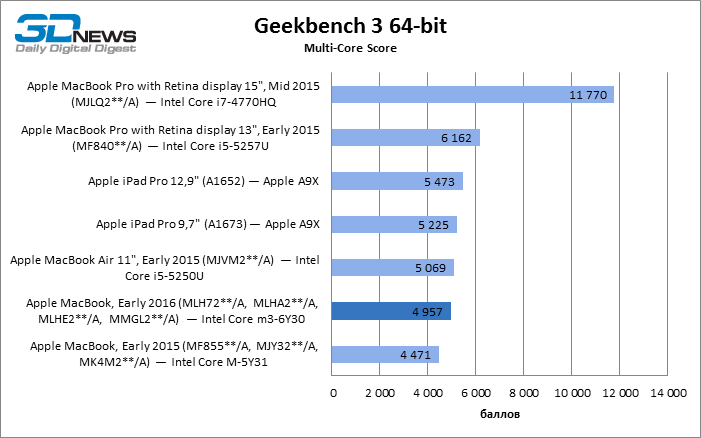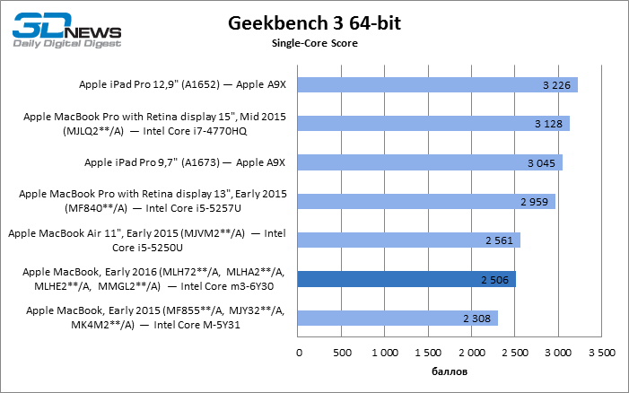 В прошлом году мы выпустили подробный обзор 12-дюймового MacBook с экраном Retina — на тот момент он был свежим дополнением к линейке продуктов Apple. Благодаря появлению процессоров Intel Core M, которые распространили архитектуру Core на сегмент ультраэкономичных с точки зрения энергопотребления систем на чипе, Apple удалось создать ноутбук, по сценарию использования близкий к планшетным ПК. При массе меньше 1 кг и пассивном охлаждении компонентов MacBook можно носить с собой постоянно и работать на одном заряде аккумулятора весь день (при условии, что рабочие задачи не требуют постоянной полной нагрузки системы). При этом на компьютере установлена полноценная десктопная ОС, а производительности достаточно для стандартных офисных приложений. Другая сторона медали — вынужденный компромисс в плане подключения различной периферии, так как в тонком корпусе нет места для каких-либо разъемов, помимо единственного USB Type-C и 3,5-мм mini jack для акустики или гарнитуры. За прошедший год в экосистеме Apple произошли изменения, которые влияют на позицию 12-дюймового «Макбука». Компания создала iPad, который претендует на звание полноценной рабочей машины, а не просто устройства для потребления контента. Обе версии iPad Pro — как с 12,9-дюймовым, так и c 9,7-дюймовым экраном — благодаря съемной клавиатуре способны заменить компактный ноутбук настолько, насколько это позволяет программное обеспечение для iOS. Кроме того, Apple оснащает планшеты экранами более высокого уровня, нежели те, которые используются в ноутбуках компании. В особенности это касается 9,7-дюймового экрана в iPad Pro, обладающего расширенным цветовым охватом DCI-P3 и цветокоррекцией с учетом фонового освещения. Да и качество работы с пером Apple Pencil впечатляет. В итоге 12-дюймовый MacBook и iPad Pro оказались очень близки по своему назначению. Кроме того, MacBook Air не увидел обновления в этом году, и мы можем предположить, что жизнь этого семейства подходит к концу. Для покупателя это означает, что если раньше выбор компактного устройства Apple для задач, выходящих за пределы мультимедийных, Интернета и обмена сообщениями, сводился к Air или новому MacBook с «ретиной», то сейчас на роль альтернативы претендует iPad Pro. В этом обзоре мы собираемся еще раз взглянуть на 12-дюймовый MacBook, теперь в обновленной конфигурации 2016 года, и сравнить его производительность с тем, что предлагает iPad Pro. Кроме того, эта модель первой из «Макбуков» получила процессор Intel поколения Skylake, в то время как остальные «Маки» ожидают перехода с Broadwell, а MacBook Pro с 15,4-дюймовым экраном и вовсе до сих пор комплектуется Haswell. Это потенциально позволит сократить тот разрыв в производительности между MacBook с «Ретиной» и MacBook Air, который мы наблюдали год назад. ⇡#Технические характеристики, ценыВсе изменения в конфигурации MacBook по сравнению с прошлогодней моделью связаны с переходом от ядра Broadwell-Y к Skylake-Y. Существуют две конфигурации ноутбука, различающиеся версией CPU (Core m3 либо m5) и объемом SSD (256 либо 512 Гбайт), плюс возможность выбрать наиболее быстрый Core m7 для обеих из них. Процессоры по-прежнему имеют стандартный TDP 4,5 Вт, но Apple использует возможность конфигурации TDP вплоть до 7 Вт, что позволило установить повышенные на 100-200 МГц базовые частоты и увеличить пространство для их кратковременных скачков. Если сравнивать с MacBook 2015 года, то предельные частоты двух младших версий были 