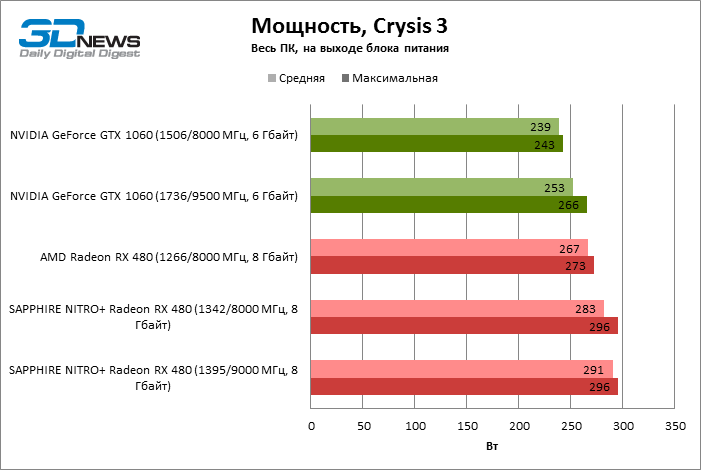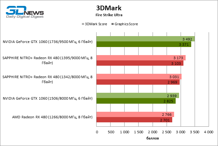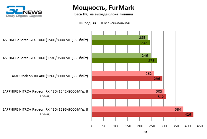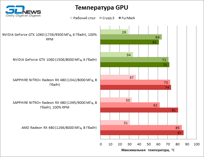 ⇡#Тактовые частоты, энергопотребление, температура, разгонТо, как NITRO+ RX 480 обращается с частотами и напряжением питания GPU, показывает всю слабость референсной видеокарты. В AMD Radeon RX 480 частота графического процессора в большинстве игр колеблется между значениями Base Clock и Boost Clock. Продукт SAPPHIRE, напротив, при тестировании в Crysis 3 большую часть времени работает на предельной частоте, указанной в спецификациях, — 1342 МГц. При этом пиковое напряжение на GPU составляет 1,175 В — существенно выше скромных 0,818–1,087 В у референсной карты. Крыльчатки системы охлаждения в NITRO+ RX 480 вращаются на скорости, сопоставимой с таковой у турбины AMD Radeon RX 480: 2016 об/мин против 2200 об/мин. Однако температура GPU у двух видеокарт различается на 12–13 °C. По-другому и быть не могло, ведь у референсного RX 480 довольно примитивный кулер, который и рядом не стоял с современной конструкцией на базе тепловых трубок. Для оценки возможностей VRM и системы охлаждения референсной и оригинальной видеокарты понаблюдаем за параметрами в стресс-тесте FurMark. Здесь SAPPHIRE позволяет GPU работать в диапазоне 1071–1091 МГц, тогда как Radeon RX 480 от AMD опускается до 697–685 МГц. График мощности объясняет, почему так происходит: компьютер с NITRO+ RX 480 на борту потребляет на 43 Вт больше. Удивляет другое: в Crysis 3 разница в мощности между AMD Radeon RX 480 и NITRO+ RX 480 далеко не столь велика (16 Вт), невзирая на разницу в частотах и тем более напряжениях питания GPU. Теперь о разгоне. Для оверклокинга NITRO+ RX 480 мы использовали интерфейс WattMan в настройках драйвера AMD, который на данный момент знаком только с референсным RX 480 и не позволяет увеличить напряжение на GPU сверх 1,15 В, а это даже ниже штатных настроек карты SAPPHIRE. Предварительно задав лимит мощности в 150% и запустив вентиляторы на полную скорость, мы смогли разогнать GPU лишь на 53 МГц, а оперативную память — на 1 ГГц (с одновременным подъемом напряжения на чипах с 1 до 1,15 В). Столь скромный разгон добавил 8 Вт к мощности системы в Crysis 3, но в FurMark энергопотребление возросло ни много ни мало на 79 Вт — ведь мы позволили GPU достигать еще более высоких частот, манипулируя лимитом TDP. К сожалению, без возможности «программного вольтмода» GPU на карте SAPPHIRE мы не можем сполна воспользоваться запасом прочности системы питания из-за ограничений AMD MattMan. Новая версия фирменной утилиты для оверклокинга SAPPHIRE TRIXX, совместимая с RX 480, которая наверняка помогла бы добиться большего, еще не была опубликована на момент подготовки обзора, а вскоре видеокарта уже покинула редакцию.      ⇡#Производительность: 3DMarkРезультат NITRO+ RX 480 в «синтетике» на 10% выше по сравнению с референсным RX 480. Карта SAPPHIRE при штатных частотах оставила позади GeForce GTX 1060, но в условиях разгона обоих устройств победа осталась за GTX 1060.
