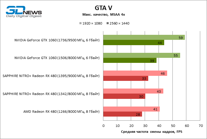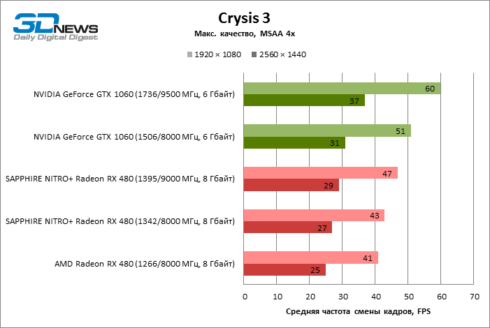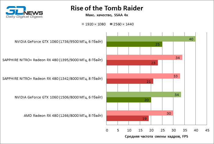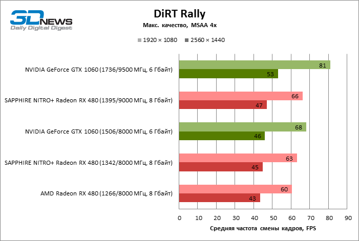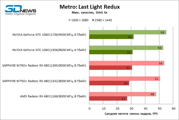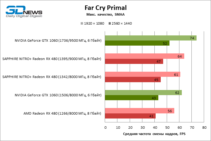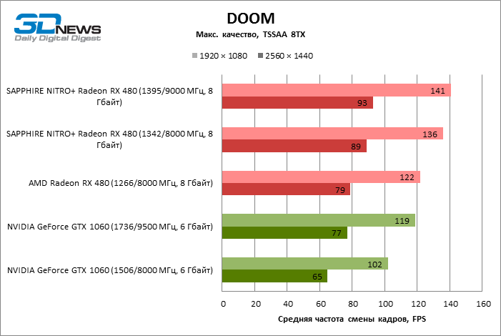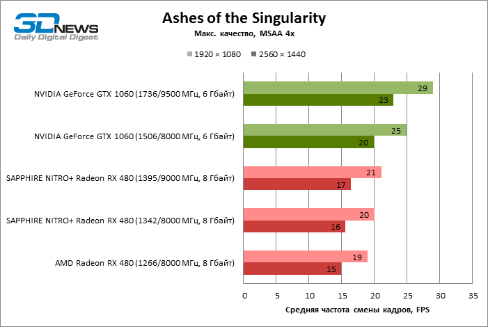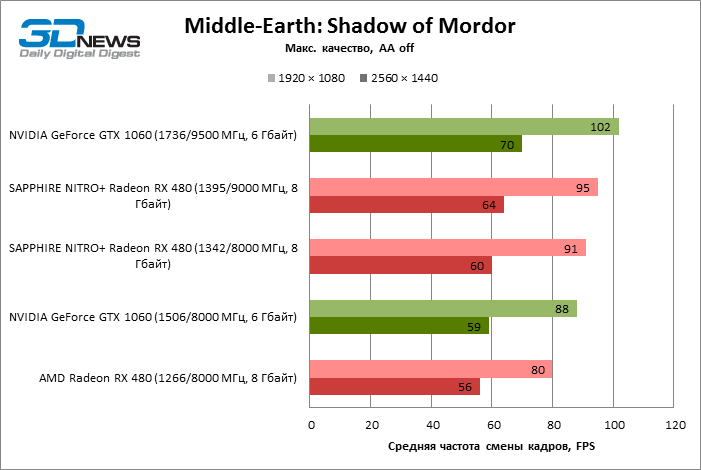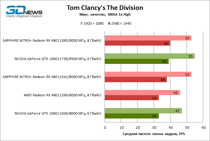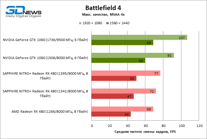 ⇡#Производительность: игры1920 × 1080, 2560 × 1440 В игровых тестах при разрешении 1080p и 1440p повышенные частоты RX 480 не так хорошо влияют на частоту смены кадров, как в 3DMark. NITRO+ RX 480 в штатном режиме лишь на 8% быстрее референсной карты, а для того, чтобы карта SAPPHIRE поравнялась с референсным GeForce GTX 1060, требуется разогнать ее настолько, насколько нам позволяет ПО в данный момент. Разогнанный GTX 1060, разумеется, не оставляет шансов ни одному из своих соперников.