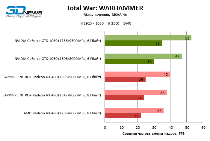 3840 × 2160 В 4К-разрешении разгон NITRO+ RX 480 (как заводской, так и дополнительный) приносит больше пользы, чем в более легких режимах. Карте SAPPHIRE даже не требуется оверклокинг, чтобы достигнуть паритета с референсным GeForce GTX 1060, но при условии разгона обоих соперников победа по-прежнему принадлежит NVIDIA.