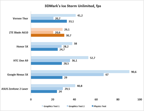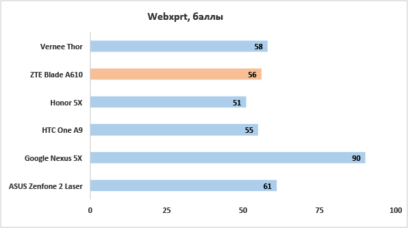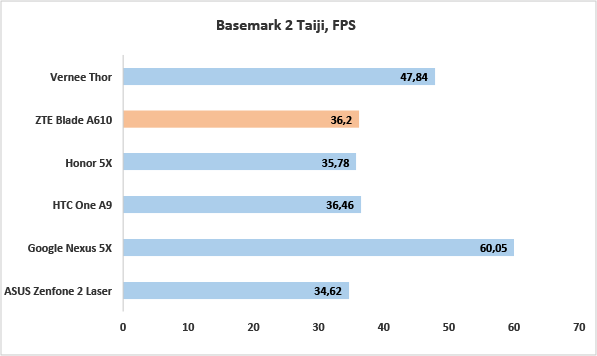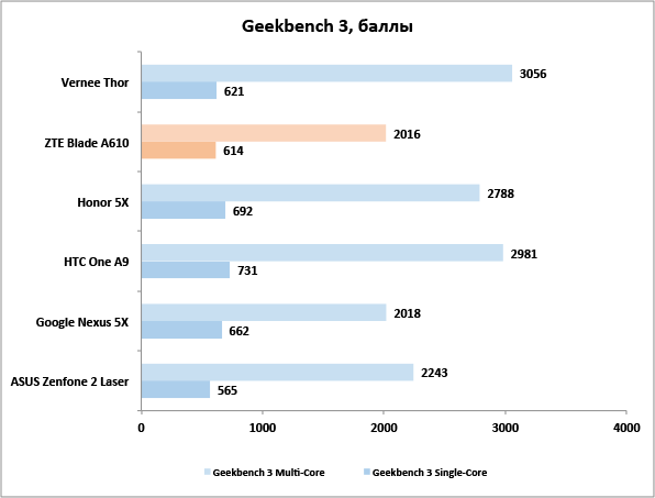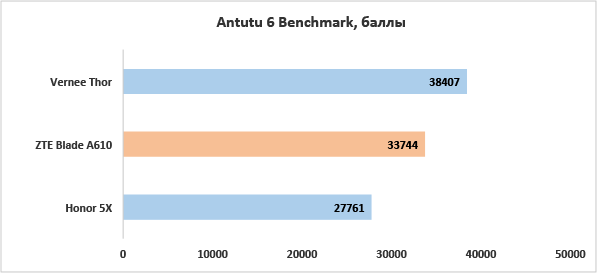 С гамма-кривыми все не очень хорошо – мы даже прогнали тест пять раз, чтобы убедиться, что наш колориметр не врет. Выяснилось, что прибор показывает правду, просто настроен экран не очень хорошо – это явно видно на графиках. Цветовой охват близок к эталонному sRGB, но все-таки слегка треугольник слегка превосходит стандарт. Это, в принципе, не критично. ⇡#«Железо» и производительностьСмартфон работает на хорошо знакомой нам системе-на-чипе MediaTek MT6735 – это привычное решение для бюджетных смартфонов. В ее состав входят четыре вычислительных ядра ARM Cortex-A53, которые трудятся на частоте 1,3 ГГц, и графическое ядро Mali-T720MP2, работающее на частоте 600 МГц. Разумеется, задействуется современный набор инструкций ARMv8-a, поддерживаются как 32-разрядные, так и 64-разрядные вычисления. Система сделана по 28-нанометровому технологическому процессу. ![]() Объем памяти стандартный для классического недорого Android-смартфона – два гигабайта оперативной памяти, шестнадцать гигабайт встроенного флеш-накопителя. Память можно расширить с помощью карточек формата microSD – правда, для этого придется пожертвовать второй симкой – разъем здесь, как это очень любят делать производители из Китая, универсальный. ![]() В синтетических тестах устройство получает совершенно стандартные для данного класса гаджетов оценки. Так, в задании AnTuTu Benchmark 6 аппарат получил чуть более 33 тысяч баллов, а в мультипоточном задании Geekbench – символичную цифру 2016. Это вполне нормальные для этого класса гаджетов показатели. ![]() На самом деле гораздо важнее результатов бенчмарков то, что устройство стабильно и гладко работает в повседневной жизни. Оно шустро переключается между приложениями, плавно отображает анимацию операционной системы, не подвисает и не глючит на пустом месте. Когда речь идет о недорогом «Андроиде», это действительно радует. Со всеми бытовыми задачами – отображением мультимедийного контента, просмотром электронных документов, веб-серфингом – аппарат справляется очень хорошо. Заслуга в этом не только используемого чипа, но и в мне меньшей степени программной оболочки MiFavor. ![]() ![]() Но для геймеров этот смартфон точно не подойдет. Какие-то простенькие аркады и головоломки смартфон «потянет», но на что-то большее рассчитывать не стоит – придется периодически мириться с вылетами, тормозами и прочими неприятностями. Для недорого устройства это абсолютно нормальная история. В целом уровень производительности в ZTE Blade A610 отлично коррелирует с небольшой ценой. ![]() ⇡#Связь и беспроводные интерфейсыДля бюджетного Android-смартфона умение работать с двумя SIM-карточками – это не роскошь, а скорее обязательство. Это и удобно, и деньги позволяет экономить. Как мы говорили ранее, ZTE Blade A610 не стал в этом вопросе исключением. Компоновка стандартная: радиомодуль в устройстве только один (стандарт Dual SIM Dual Standby) – соответственно, при голосовом вызове вторая карточка становится временно недоступной, на этот случай следует настроить переадресацию. Работать с двумя карточками очень просто: нужно определить, с какой из них звонить, отправлять SMS/MMS и выходить в сеть по умолчанию. Для этого есть специальный пункт в меню настроек. Одна из карточек может работать в сетях третьего и четвертого поколения – поддерживается стандарт LTE Cat. 4 с максимальной теоретической скоростью приема данных 150 Мбит/с,