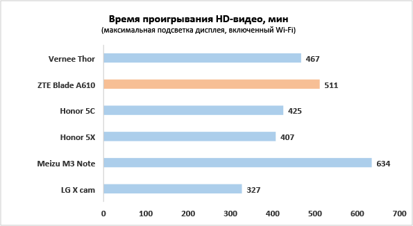 ⇡#Автономная работаКак мы говорили ранее, в ZTE Blade A610 установлен очень емкий аккумулятор – на 15,2 Вт·ч (4000 мА·ч, 3,8 В). Обычно одноклассники довольствуются батарейками поменьше – на 2500-2800 мА·ч. Пожалуй, это основное преимущество Blade A610 перед конкурентами – его аккумулятора стабильно хватает на сутки эксплуатации, если же пользоваться не слишком активно, то можно рассчитывать и на полтора-два дня автономной работы. На полный цикл зарядки с помощью комплектного адаптера уходит примерно три часа. ![]() В нашем тесте на воспроизведение HD-видео на максимальной яркости устройства, с активным Wi-Fi-соединением и обновлением данных в фоновом режиме, аппарат продержался восемь с половиной часов. Результат блистательный! И еще интересный момент – с помощью A610 можно заряжать другие устройства за счет технологии USB OTG. ⇡#ЗаключениеZTE Blade A610 – это на первый взгляд вполне стандартный смартфон средней ценовой категории: обычный дисплей, не очень примечательная техническая начинка, умеет работать, как и многие, с двумя симками. Выраженных недостатков мы не обнаружили. Вполне сбалансированный гаджет, который и ожидаешь получить за 12-13 тысяч рублей – каких, казалось бы, много. Но ZTE Blade A610 припрятал в рукаве козырь – очень емкий аккумулятор, за счет которого он и выделяется среди конкурентов. Достоинства ZTE Blade A610: