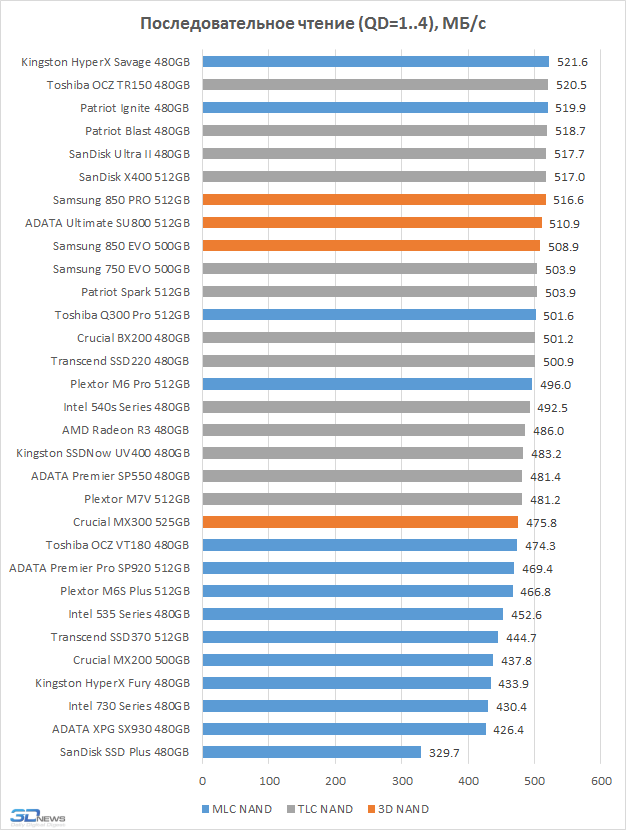 Также необходимо отметить, что новые накопители, в основе которых лежит трёхмерная TLC-память компании Micron, тоже способны показывать приличные результаты при комплексных нагрузках. Особенно неплох Crucial MX300 на базе контроллера Marvell 88SS1074.