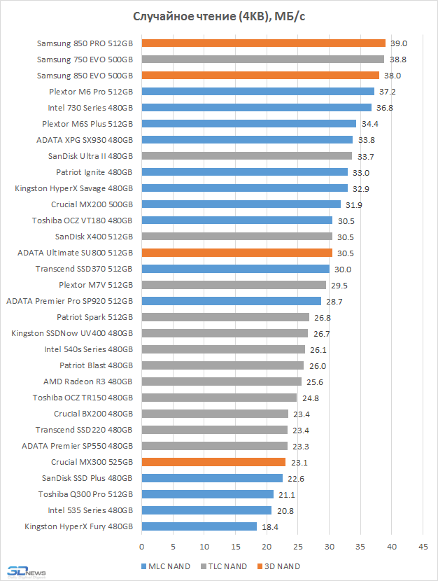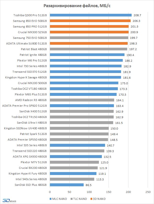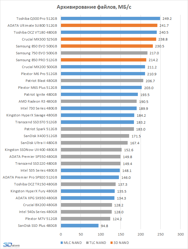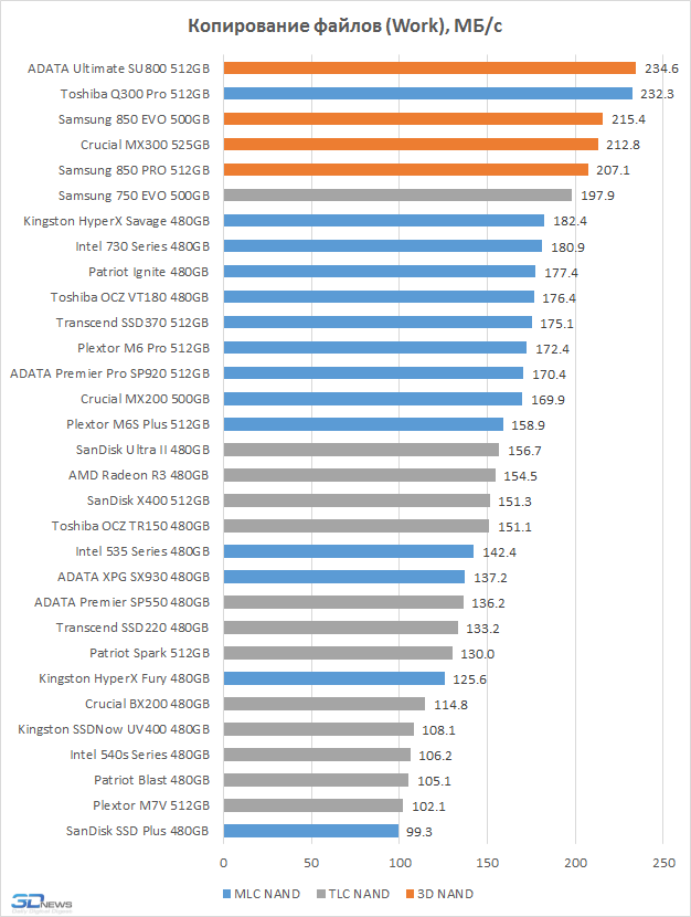 Копирование файлов внутри накопителя – хороший пример смешанной нагрузки. И поэтому высокую производительность выдают здесь те накопители, которые имеют специальные оптимизации для таких сценариев работы. В числе лидеров закономерно оказываются ADATA Ultimate SU800, Toshiba Q300 Pro, Crucial MX300 и вся троица накопителей Samsung в составе 850 PRO, 850 EVO и 750 EVO. В общем же правило такое: SSD на MLC-памяти лучше, чем SSD на TLC-памяти, но максимальную скорость при копировании можно увидеть у тех моделей накопителей, которые основаны на 3D NAND производства как Samsung, так и Micron.