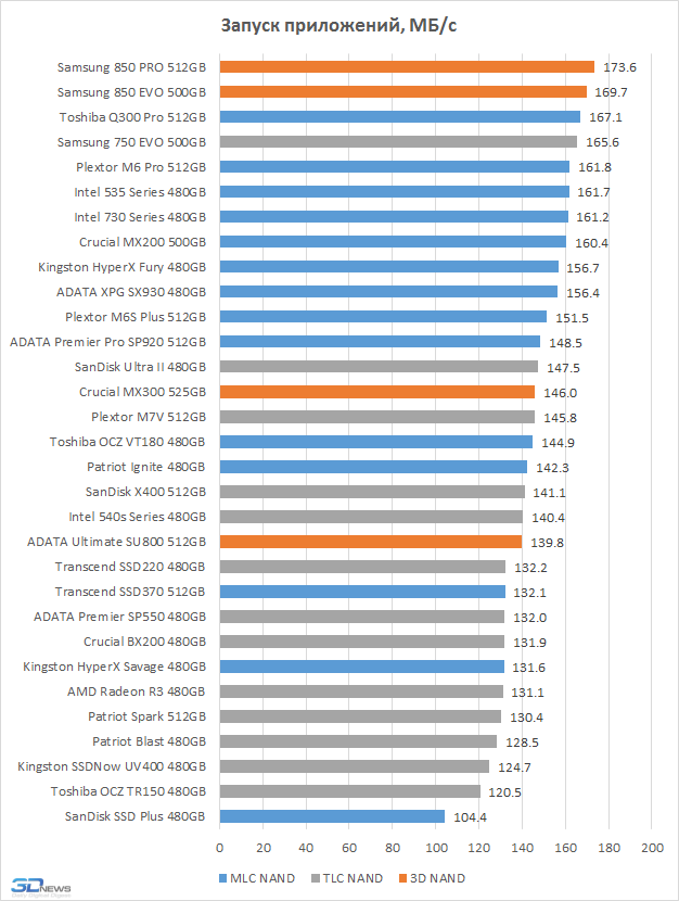 Если же ориентироваться на скорость запуска с SSD приложений для создания контента, то тут к числу названных выше Samsung 850 PRO и 850 EVO, Crucial MX200, Toshiba Q300 Pro и Intel 730 стоит добавить Plextor M6 Pro. А из TLC-накопителей хорошими результатами могут похвастать Samsung 750 EVO, SanDisk Ultra II и Plextor M7V.