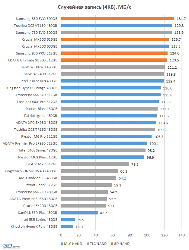 При измерении скорости случайной записи в числе быстрейших оказываются как накопители на базе MLC NAND, так и модели, основанные на 3D NAND и даже на TLC NAND. Очевидно, что применяемые в сегодняшних платформах технологии ускоренной записи действительно помогают сгладить различия между накопителями на принципиально различной памяти. Однако обратите внимание, в группе лидеров нет ни одного SSD, который бы был основан на каком-либо контроллере независимого тайваньского разработчика, будь то Phison, JMicron или Silicon Motion. Это явно указывает на существующий разрыв в мощности и качестве оптимизации платформ Marvell, Samsung или Intel и их менее именитых конкурентов.