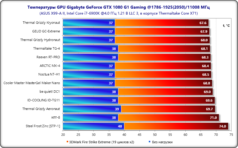 Последовательность тестирования каждой термопасты была следующей. На тщательно обезжиренный спиртовыми салфетками кристалл графического процессора мы минимальным слоем наносили термопасту, после чего собирали видеокарту, устанавливали её в системный блок, затем закрывали его и запускали. После загрузки Windows запускался заранее сохранённый профиль разгона видеокарты в MSI Afterburner, программы мониторинга и 3DMark. Первая тестовая сессия Fire Strike Extreme из 19 циклов бенчмарка всегда являлась предварительной — её результаты не учитывались. Далее на стабилизацию температур внутри корпуса системного блока отводилось около 15 минут, а затем стартовала основная тестовая сессия, результаты которой уже шли в зачёт. После её окончания и фиксации результатов мы разбирали видеокарту, очищали и обезжиривали обе контактные поверхности, а затем ту же самую термопасту наносили ещё раз — и всё вышеперечисленное повторялось снова. Такая двукратная проверка каждого термоинтерфейса позволила избежать ошибок и получить весьма точные результаты с погрешностью не более 0,5 градуса Цельсия.