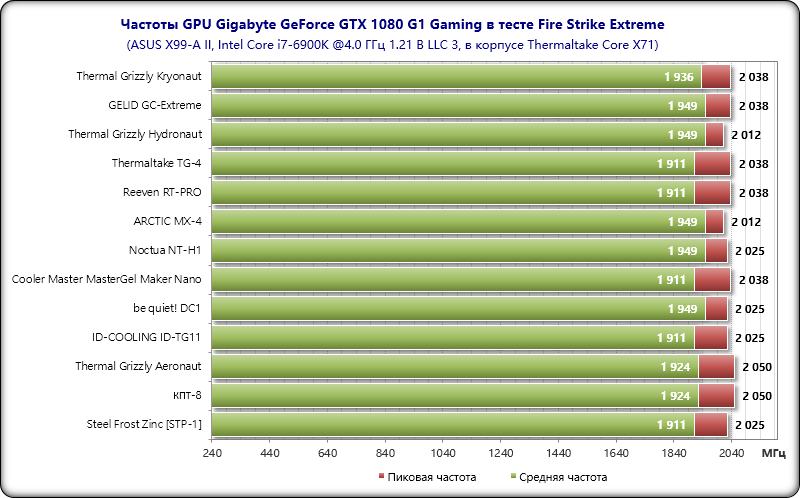 Одновременно с мониторингом температур видеокарты мы фиксировали значения 3D-частот графического процессора в каждом тесте, причём как средние за всю сессию Fire Strike Extreme, так и пиковые. Эти результаты представлены на следующей диаграмме.