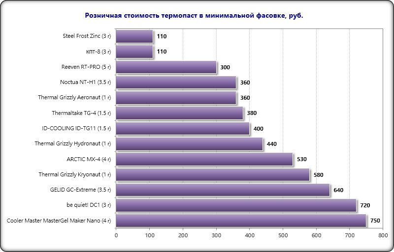 Ну и заключительной диаграммой нашего сегодняшнего тестирования термопаст будет сравнение их стоимости на российском рынке при покупке в минимальном объёме.