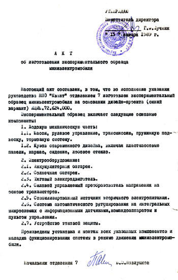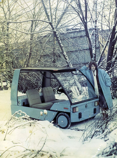 Тогда Скоков и выступил с идеей - раз не получается пока сделать нормальный развозной грузовичок, давайте попробуем сменить вектор исследований. И предложил концепцию легкого прогулочного автомобиля для курортных зон. Двух-трехместный, с солнечными батареями на крыше. Последнее, очевидно, было предложено в рамках модной тогда конверсии - "Квант" был ведущим разработчиком и изготовителем фотоэлектрических элементов для космической аппаратуры. Солнечная батарея, конечно, должна использоваться не как основной источник энергии, а как дополнительный, для подзарядки аккумуляторов.