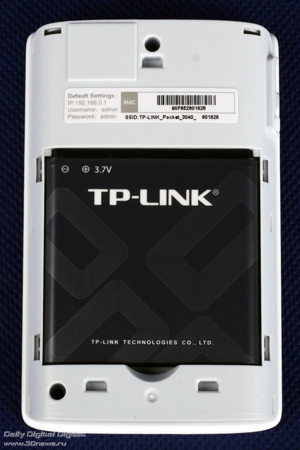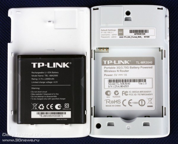 Если снять заднюю крышку и вынуть батарею, взору откроются служебные наклейки с серийным номером, версией железа, MAC-адресом, параметрами доступа к веб-интерфейсу и SSID. Крышка аккумуляторного отсека довольно тонкая, но прочная. Снять её не составит особого труда, но и при падении она наверняка отлетит.