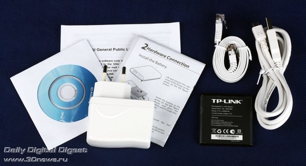 В комплекте с роутером также идут небольшая инструкция, гарантийный талон, диск с ПО и аккумулятор на 7,4 Вт*ч. В российских магазинах аналогичную батарею с ходу найти не удалось, зато у зарубежных торговцев её или аналог можно купить по цене от 500 рублей и выше.