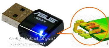 В этом случае придётся докупать внешний Wi-Fi-адаптер стандарта 802.11n с интерфейсом USB, а на маленьких 10-11-дюймовых моделях любое внешнее устройство в лучшем случае просто вызывает раздражение, а в худшем мешает комфортной работе. Решением данной проблемы может стать новый, работающий в стандарте 802.11n, Wi-Fi-адаптер компании ASUSTeK Computer Inc. Производитель заверяет, что в своём классе ASUS USB-N10 является самым компактным в мире. Благодаря тому, что из USB-порта это устройство выступает всего на 16 мм, его можно вообще не вынимать из ноутбука при транспортировке, во всяком случае, так уверяет на своём официальном сайте ASUS. Соответственно, о дискомфорте, возникающем при работе новинки даже с самым маленьким нетбуком, точно можно забыть.