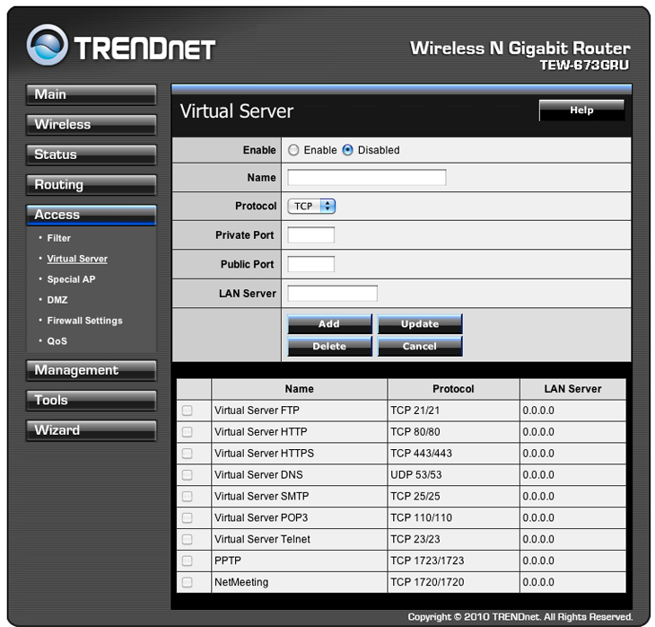 TEW-673GRU может обеспечить полноценный доступ к локальным ресурсам из Интернета. Поддерживается динамическая регистрация доменного имени с помощью нескольких популярных поставщиков этой услуги. Можно создать DMZ или «пробросить» порты отдельных протоколов через NAT к локальным узлам. Сам маршрутизатор также настраивается через Интернет после активации соответствующих опций.
