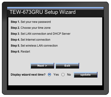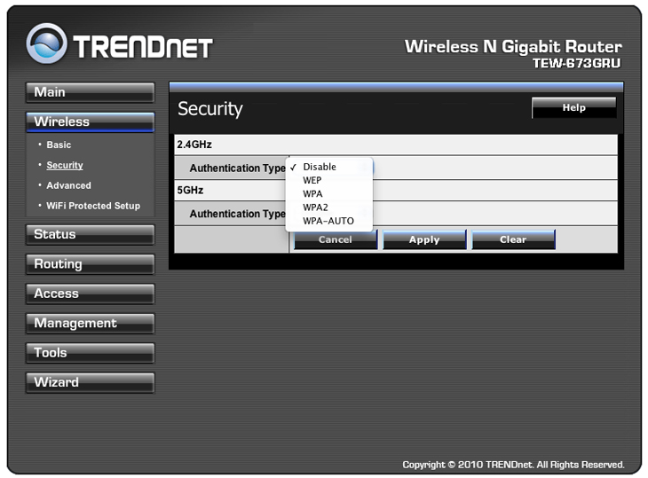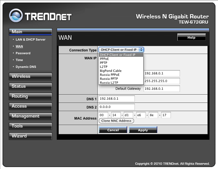 Несмотря на то, что беспроводной маршрутизатор – устройство полезное, востребованное и подчас необходимое, большинство представителей этого класса оборудования совершенно недружественны к пользователю, и TRENDnet TEW-673GRU не стал приятным исключением. Без начальных знаний в области сетевых технологий подготовить его к работе не получится. Единственный способ настройки маршрутизатора – через веб-интерфейс с традиционным для техники TRENDnet IP-адресом по умолчанию – 192.168.10.1. Никаких утилит для обнаружения и конфигурации устройства на прилагаемом CD нет. Неподготовленным пользователям придется довериться путеводной нити мастера настроек, который запускается при первом посещении веб-интерфейса, да и то в процессе настройки не раз появятся такие пугающие аббревиатуры, как DHCP, L2TP, PPPoE и др. Ситуацию усугубляет тот факт, что устройство общается с владельцем лишь на английском языке.