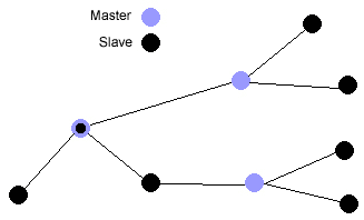 Оказавшись рядом, Bluetooth устройства могут устанавливать не только соединения типа точка-к-точка, когда имеется только два устройства, но и точка-к-многоточек, когда одно устройство одновременно работает с несколькими другими. При соединении одного устройства с несколькими другими, устройство которое обслуживает несколько соединений называется master, а подключенные устройства - slave. К одному master’у может быть подключено до семи активных slave. Кроме активных slave (то есть, устройств которые активно обмениваются данными), может существовать множество неактивных slave, которые не могут обмениваться данными с master пока заняты все каналы, но, тем не менее, остаются синхронизированы с ним. Такая структура называется piconet.