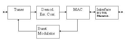 Рассмотрим конкретную реализацию этой технологии, на примере сети кабельного телевидения "Balticum TV" Клайпеда, Литва. Для предоставления услуг интернет по сети кабельного телевидения, в нашем случае было выбрано оборудование производства Bay Networks, из серии LANCity. Из дополнительного оборудования, несвойственного обычным сетям кабельного телевидения, необходимо только одно LСe устройство (Integrated Headend Node), которое устанвливается на центральной станции, и кабельные модемы у каждого из клиентов. С целью снижения первоначальных затрат на оборудование, на головной станции "Balticum TV" вместо полноценного LСe устройства установлен модифицированый LCb модем, который обычно используется для предоставления доступа к LCe устройству рабочей группе. В нашем случае, он доработан так, что сам является LCe устройсвом, и способен обслуживать 512 клиентских модемов. Само собой, с ростом сети LCb модем может быть заменен на полноценное LСe устройство, без какой либо доработки всей остальной сети. Кабельные модемы составляют основу любой подобной сети, поэтому будет полезно остановится на их поподробнее. В Северной Америке подобные технологии развивались довольно давно, и видов кабельных модемов разработано множество. Но, несмотря на обилие стандартов и разнообразие моделей, зачастую абсолютно несовместимых друг с другом, большинство телевизионых кабельных модемов имеют одинаковую структуру, представленную на схеме:
