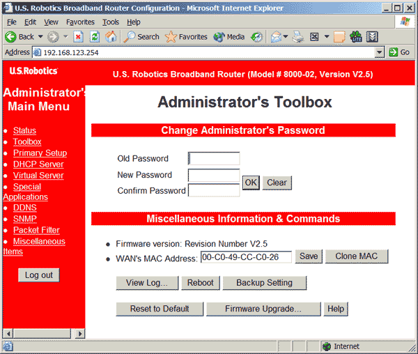 Все настройки маршрутизпатора выполняются через очень простой web-интерфейс. По умолчанию маршрутизатору присвоен IP 192.168.123.254, и что бы залогиниться на него, достаточно просто набрать этот адрес в броузере любого компьютера, подключенного к любому из LAN портов на маршрутизаторе. Загрузится страница с информацией о текущем статусе маршрутизатора и с предложением ввести пароль. В настройках по умолчанию никакого пароля нет, поэтому надо просто нажать на кнопку Log in. Все настройки собраны в несколько страниц. Первая из них, Administrator’s Toolbox.