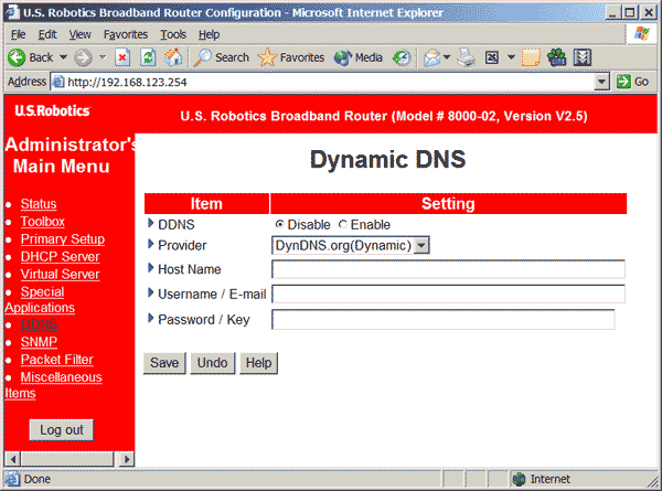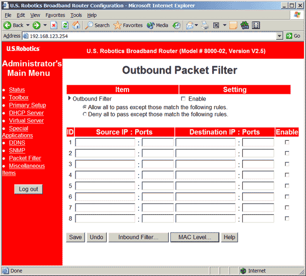 В последнем окне собраны настройки, которые не подходят ни к одному из прошлых окон. Из наиболее интересных окон доступных здесь можно отметить возможность включить один IP адрес из внутренней сети так называемую DMZ (демилитаризованную) зону. Это означает, что любые пакеты предназначенные для этого адреса и идущие с этого адреса будут свободно пропускаться firewall. Кроме этого, здесь можно включить возможность управлять маршрутизатором не только из внутренней сети, но и из внешней. По умолчанию эта функция выключена, и в ней стоит адрес 0.0.0.0 Это означает, что если включить эту возможность, то зайти на маршрутизатор для конфигурирования сможет любой кто знает его IP адрес и пароль для доступа. Если вместо нулей записать что-либо более конкретное, то конфигурирование будет возможно только с указанного IP. На возможность доступа из внутренней сети это не влияет.