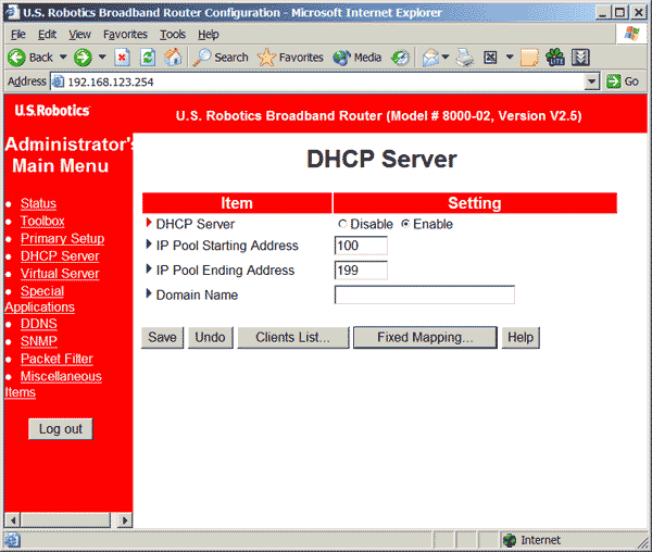Как и большинство подобных устройств, наш маршрутизатор имеет встроенный DHCP сервер, возможностей которого хватит для подавляющего большинства пользователей. Можно выставить диапазон, из которого будут выделяться адреса, посмотреть текущий статус (кому и какие адреса уже выделены), и назначить определённым MAC адресам фиксированные IP (кнопка Fixed Mapping...)