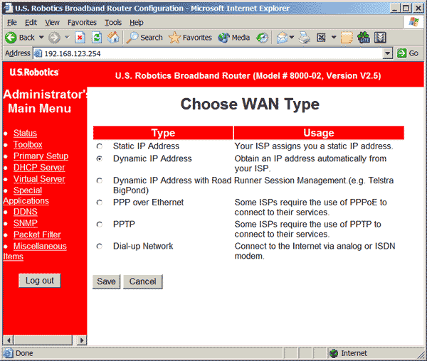 Поддерживаются практически все виды интернет соединений, которые можно встретить в природе. Ваш провайдер может предоставлять вам постоянный IP адрес, может динамический, он может требовать соединения по PPP over Ethernet (PPPoE) (характерно для aDSL соединений), PPTP или обычное Dial-Up соединение, маршрутизатор сможет работать с ними всеми. Единственное условие, это что бы была возможность подключить линию к маршрутизатору физически. А здесь у нас всего два варианта, либо обычное Ethernet соединение через WAN порт, либо модем (любой, хоть обычный для телефонной линии, либо ISDN) подключаемый через COM порт. Таким образом, если ваш провайдер предоставляет вам оборудование работающее через USB порт (без разницы что это, модем, aDSL модем, кабельный модем, или что то ещё), придётся побеспокоиться о его замене.