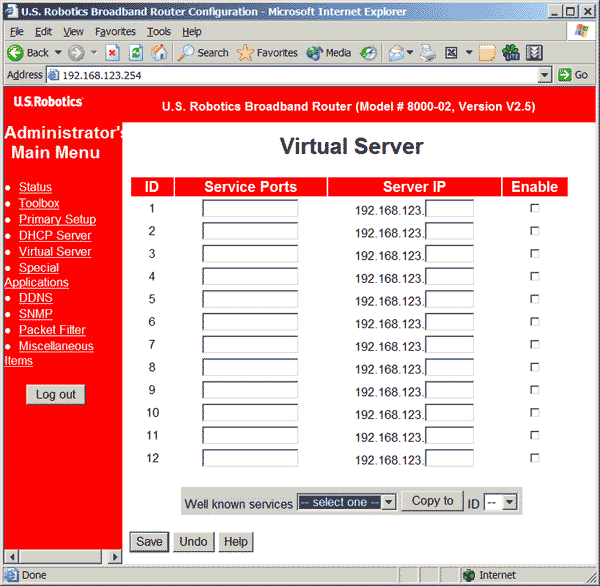 - Виртуальный сервер (определяемая пользователем функция переадресации порта);