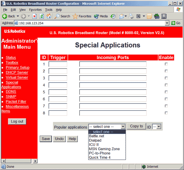 В маршрутизатор встроен firewall, который блокирует трафик о назначении которого маршрутизатор не знает. С одной стороны это затрудняет жизнь "злобным хацкерам" и просто излишне любопытным гражданам, с другой стороны, эта функция не даст работать и вполне честным приложениям. Для решения этой проблемы и нужна эта страница. Если вы используете службу, которой для работы необходимо обращение на нестандартный порт из вне, это можно настроить здесь. Требуется указать trigger, порт куда будет идти обращение и порт который должен открыться после того как придёт пакет-trigger. Как и в случае с виртуальным сервером, есть предустановки для наиболее популярных приложений (Battle.net, Microsoft Gaming Zone, QuickTime 4, и некоторых других).