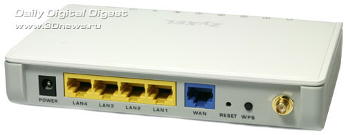 Все разъемы находятся на задней панели корпуса. Здесь, помимо указанных в спецификации интерфейсов, имеется гнездо для подключения адаптера питания, разъем для установки антенны, кнопка, активирующая функцию WPS (Wi-Fi Protected Setup), и кнопка перезагрузки/принудительного сброса настроек. Как и у большинства других роутеров, все разъемы у ZyXEL NBG334W EE размещены так, чтобы ими было удобно пользоваться, а подключаемые провода можно было связать в единый пучок.