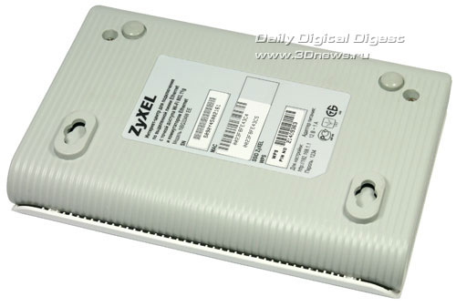Компоновку ZyXEL NBG334W EE можно охарактеризовать одним словом - классическая. Устройство выполнено в виде традиционной пластиковой "коробочки", единственным дизайнерским изыском которой можно считать переднюю панель с нависающим козырьком. Верхняя часть корпуса выполнена из лакированного белоснежного пластика, а нижняя - из серого с выраженной шероховатостью. Кроме того, вся нижняя часть имеет рифление, придающее новинке не слишком скучный облик. Для пассивного охлаждения устройства предусмотрены многочисленные вентиляционные отверстия на боковых гранях, а также на передней панели под козырьком.