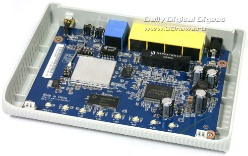Интернет-центр собран на одной печатной плате. Пайка всех элементов очень аккуратная, так что к качеству сборки никаких претензий не возникает. В целом, элементная база полностью отвечает заявленным характеристикам устройства.