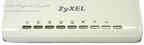 Передняя панель несет на себе девять достаточно крупных светодиодных индикаторов для информирования пользователя о питании интернет-центра, сетевых соединениях, работе выделенной линии и беспроводной сети, а также о том, защищена ли на данный момент сеть Wi-Fi от несанкционированных подключений или нет.