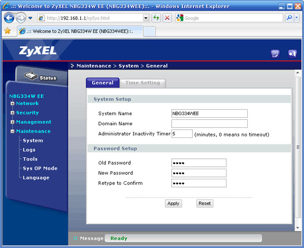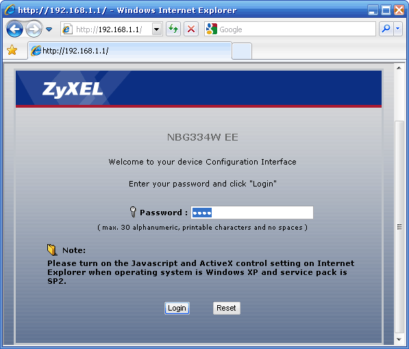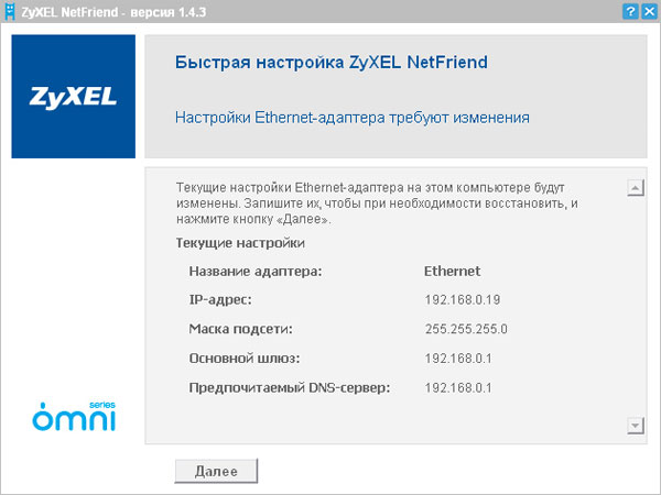 Впрочем, для начала работы с устройством вовсе не обязательно использовать утилиту ZyXEL NetFriend!, а достаточно после подключения ввести в строке браузера адрес 192.168.1.1 (ваш компьютер должен находиться в этой же подсети 192.168.1.х), а вместо запрашиваемого пароля - "1234".