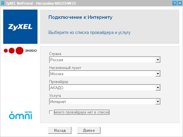 Как и многие другие интернет-центры ZyXEL, модель NBG334W EE работает под управлением фирменной сетевой операционной системы ZyNOS. Мы тестировали устройство с прошивкой версии 3.60 (AMW.3). Для быстрой настройки маршрутизатора на диске из комплекта поставки записана утилита ZyXEL NetFriend! версии 1.4.3. С ее помощью можно не только найти все подключенные к сети устройства ZyXEL, но и максимально быстро настроить интернет-подключение. Для этих целей программа имеет ряд предустановок для работы с провайдерами многих крупных городов России. Если же вашего провайдера в списке нет, то настройки придется задавать вручную.