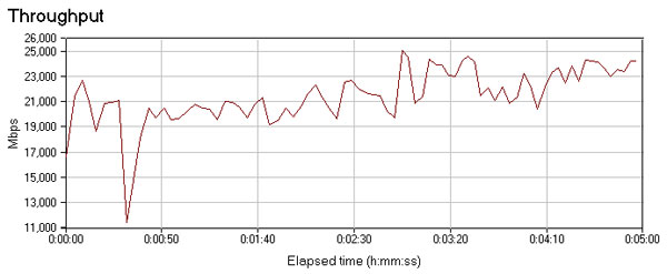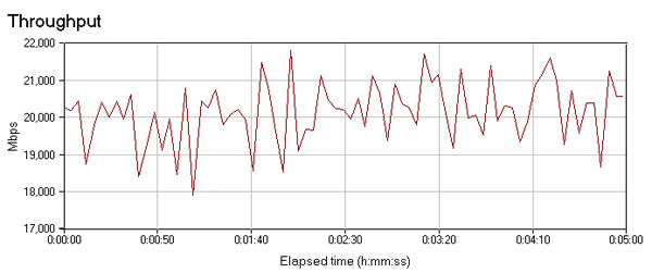 Основной целью тестирования является выяснение производительности ZyXEL NBG334W EE при работе как в беспроводном сегменте сети, так и в проводном. Начнем с последнего. Производительность оценивалась при передаче данных между портами WAN и LAN, для чего к каждому из них были подключены две одинаковые тестовые платформы следующей конфигурации: процессор Intel Pentium 4 631 3000 МГц, платформа ASUS P5KPL (Intel G31) со встроенным гигабитным сетевым адаптером Atheros L1, видеокарта Radeon X550 128 Мб, память 1024 Мб DDR2-800 SDRAM, ОС Windows XP Pro SP3 Rus. На оба компьютера были установлены программы-сенсоры (конечные точки) тестового пакета NetIQ Chariot. Консоль управления этого пакета была установлена на компьютер, расположенный в LAN-сегменте - оттуда и генерировался весь трафик. В качестве скрипта для передачи был выбран файл High_Performance_Throughput.scr. Время работы каждого этапа теста ограничивалось пятью минутами.