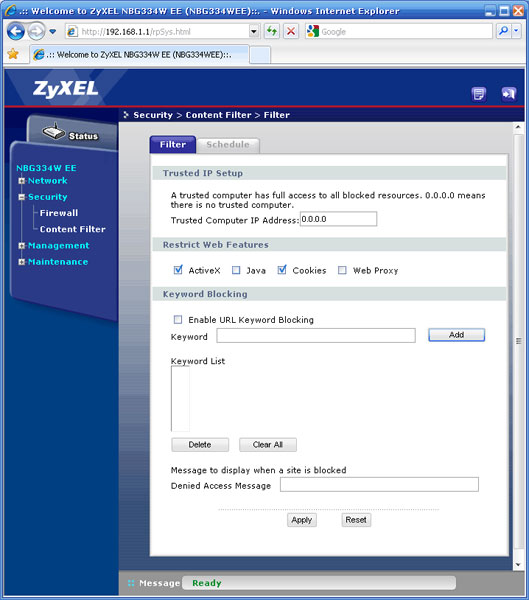 Основные настройки безопасности осуществляются в разделе Security. Здесь можно настроить встроенный межсетевой экран SPI, а также фильтр адресов и содержимого страниц. Настроек межсетевого экрана минимум: разрешение для ведения журнала, разрешение на ответы запросов ping. Кроме того, можно создать свои собственные правила, где можно осуществлять блокировку по адресу или протоколу, а также устанавливать расписание работы.