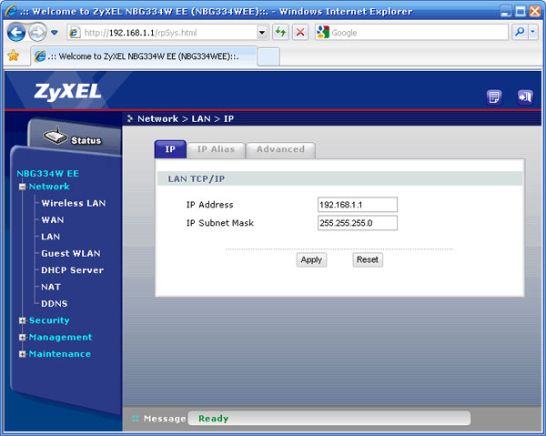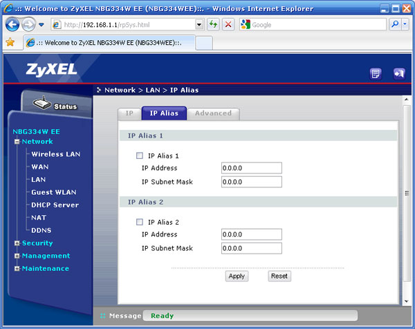 Настройки LAN-сегмента предусматривают задание одного основного IP-адреса и двух дополнительных псевдонимов (IP Alias). Эта возможность необходима в том случае, если есть необходимость разделить физическую сеть на несколько логических участков. В этом случае ZyXEL NBG334W EE будет выполнять роль межсетевого шлюза.