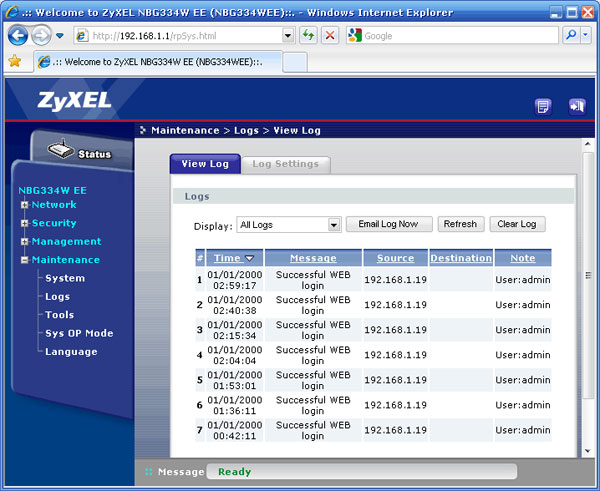 Ну а все системные настройки, такие как имя, пароль, время и т.д., собраны в последнем, четвертом разделе - Maintenance. Здесь же можно посмотреть и настроить журнал событий, а также обновить прошивку интернет-центра.