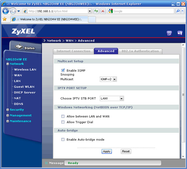 Другая особенность новинки - работа с аппаратной функцией TVport. При ее подключении Ethernet-коммутатор направляет интернет-трафик и трафик IPTV на разные порты. При этом процессор устройства не нагружается. То есть даже если ZyXEL NBG334W EE занят закачкой торрентов, то это никоим образом не скажется на качестве просмотра телепрограмм.
