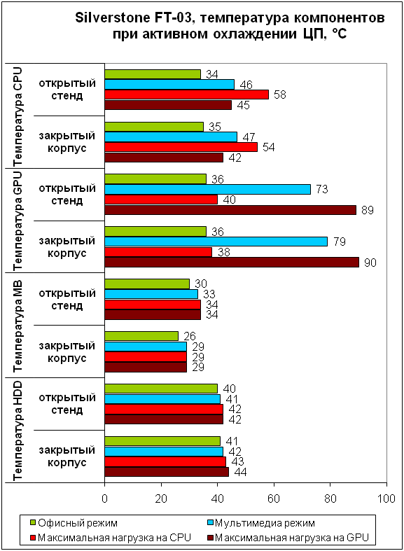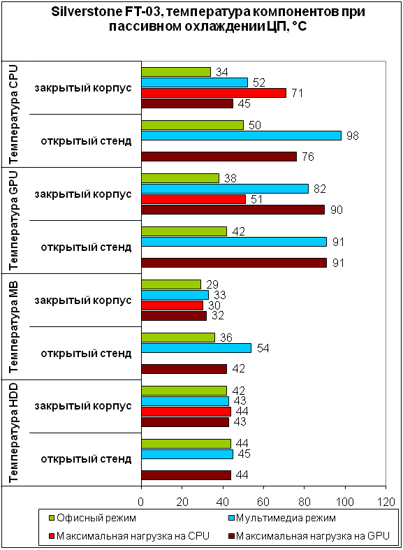 При пассивном охлаждении открытый стенд было решено не тестировать в режиме максимальной нагрузки на CPU, поскольку температура процессора в мультимедиарежиме достигла отметки в 98 °C, что очень близко к критическому значению. Отключение вентилятора на радиаторе процессора не сильно повлияло на эффективность системы охлаждения корпуса, и хотя температуры всех компонентов заметно увеличились, однако до критических значений им далеко. Наиболее благоприятные условия снова у материнской платы, ее максимальная температура не превышает 33 °C.