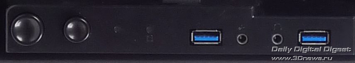 Оба порта поддерживают третью версию интерфейса, рядом с ними разместились еще и аудиоразъёмы, а также индикаторы системной активности. Здесь же находятся две почти одинаковые кнопки — та, что крупнее, отвечает за питание, а меньшая перезагружает компьютер.